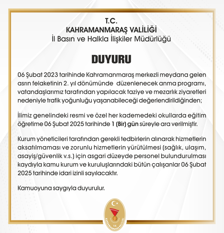ANKARA (İGFA) - 6 Şubat 2023'te meydana gelen deprem felaketinin 2. yılında yapılacak anma programı ve mezarlık ziyaretleri dolayısıyla Malatya ve Kahramanmaraş valilikleri resmi ve özel her kademedeki okulların 6 Şubat'ta eğitim öğretime bir gün ara vereceğini duyurdu.