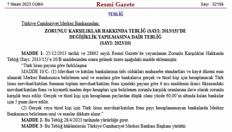 Öte yandan Zorunlu Karşılıklar Hakkında Tebliğ'de Değişiklik Yapılmasına Dair Tebliğ de yayımlayan Merkez Bankası, 28 Nisan 2023 tarihinde yürürlüğte girecek TL payına göre farklılaşma mevcut tebliğe ilave etti.