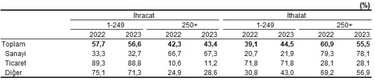 Sanayi sektörünün ihracatında 250+ kişi çalışanı olan büyük ölçekli girişimler yüzde 67,3 pay ile öne çıktı. Ticaret sektörünün ihracatında ise yüzde 88,8 pay ile 1-249 kişi çalışanı olan küçük ve orta ölçekli girişimlerin hâkimiyeti devam etti.