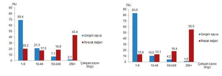 İthalatta, 10-49 kişi çalışanı olan küçük ölçekli girişimlerin payı yüzde 13,1, 50-249 kişi çalışanı olan orta ölçekli girişimlerin payı yüzde 18,4 oldu.