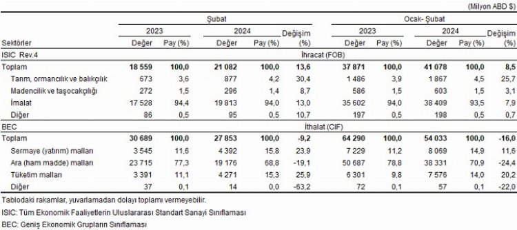Türkiye İstatistik Kurumu ile Ticaret Bakanlığı iş birliğiyle genel ticaret sistemi kapsamında üretilen geçici dış ticaret verilerine göre; ihracat 2024 yılı Şubat ayında, bir önceki yılın aynı ayına göre yüzde 13,6 artarak 21 milyar 82 milyon dolar, ithalat yüzde 9,2 azalarak 27 milyar 853 milyon dolar olarak gerçekleşti.