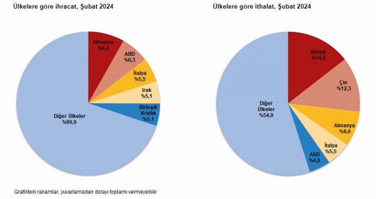 İthalatta Rusya Federasyonu ilk sırayı aldı. Şubat ayında Rusya Federasyonu'ndan yapılan ithalat 4 milyar 27 milyon dolar olurken, bu ülkeyi sırasıyla; 3 milyar 434 milyon dolar ile Çin, 2 milyar 218 milyon dolar ile Almanya, 1 milyar 543 milyon dolar ile İtalya, 1 milyar 337 milyon dolar ile ABD izledi. İlk 5 ülkeden yapılan ithalat, toplam ithalatın %45,1'ini oluşturdu.