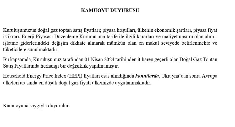 BOTAŞ, Nisan ayı itibarıyla mesken ve sanayi abonelerinin kullandığı gazın ve elektrik üretim amaçlı gazın satış tarifesinde değişiklik yapılmadığını açıkladı.