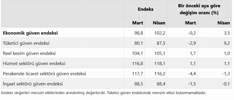 TÜİK'in açıkladığı istatistiki değerlere göre Ekonomik Güven Endeksi, Mart ayında 98,8 iken, Nisan ayında yüzde 3,5 oranında artarak 102,2 değerini aldı.