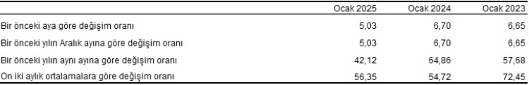 TÜFE'deki (2003=100) değişim 2025 yılı Ocak ayında bir önceki aya göre yüzde 5,03, bir önceki yılın Aralık ayına göre yüzde 5,03, bir önceki yılın aynı ayına göre yüzde 42,12 ve 12 aylık ortalamalara göre yüzde 56,35 olarak gerçekleşti.