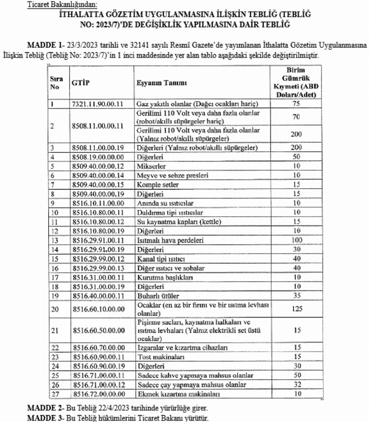 ANKARA (İGFA) - Ticaret Bakanlığı, birim gümrük değeri adet başına 10 ila 200 doların altında olan bazı elektrikli ev cihazlarının ithalatında 23 Nisan'dan itibaren gözetim uygulanacağı 23 Mart'ta açıklamıştı.