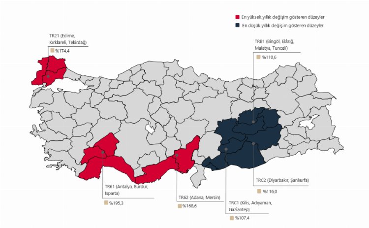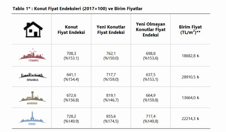 Endeks değerleri bir önceki yılın aynı ayına göre, İstanbul, Ankara ve İzmir’de sırasıyla yüzde 154,4, 156,8 ve 149,9 oranlarında artış gösterirken, bir önceki yılın aynı ayına göre yüzde