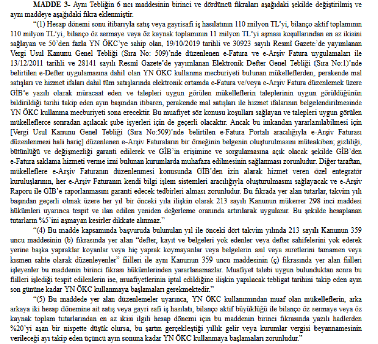 Yayımlanan tebliğle, Gelir İdaresi Başkanlığına yapılacak bildirimlerin usulleri net olarak belirlendi. Ayrıca ödeme kaydedici cihaz muafiyetinden yararlanılabilmesi için taşınması gereken şartlar ve limitler güncellendi ve bu limitlerin her yıl yeniden değerleme oranında artırılması öngörüldü. Ayrıca iki yıl üst üste bu şartları taşımayanlar tekrar ödeme kaydedici cihaz kullanmaya başlayacak.
