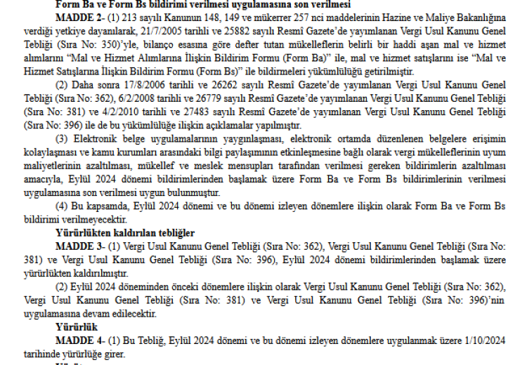 2005 yılından bu yana bilanço esasına göre defter tutan mükellefler tarafından verilen ve 1,6 milyon mükellefin alım ve satımlarını bildirildiği Ba-Bs uygulamasına son verildi.