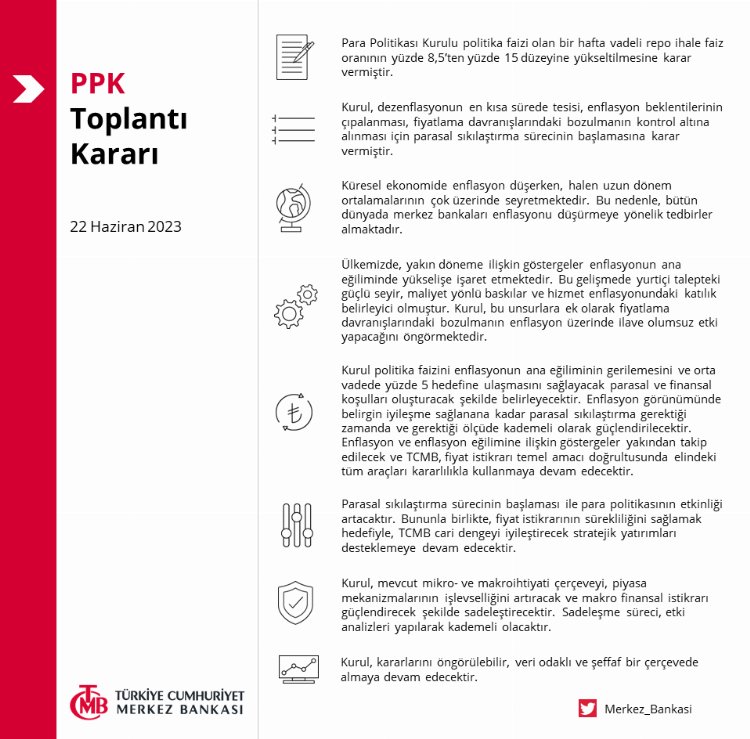 Merkez Bankası, Para Politikası Kurulu toplantısının özetini yayımladı. Özette, parasal sıkılaştırma sürecinin enflasyonda belirgin düşüş yaşanana kadar süreceği vurgulandı.