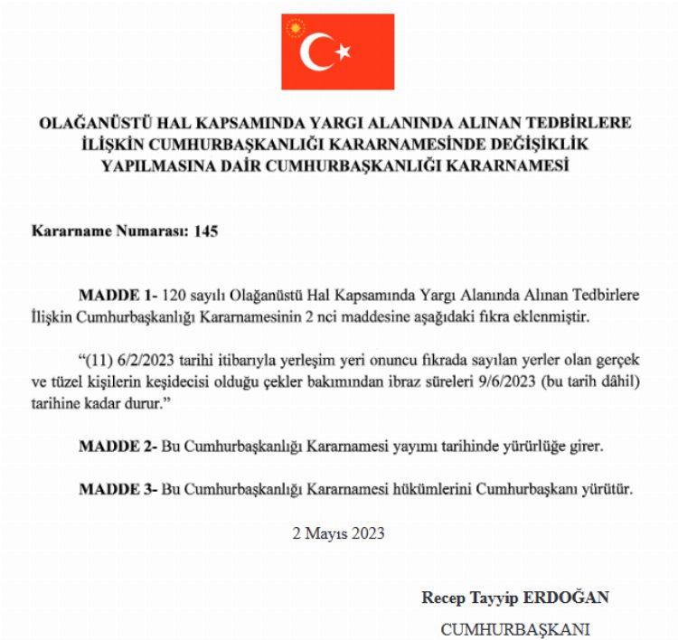 Cumhurbaşkanlığı Kararnamesi ile OHAL bölgesinde çek düzenlemesine gidildi.