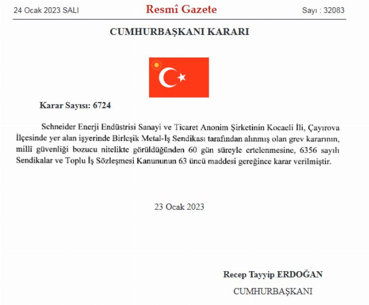 KOCAELİ (İGFA) - Cumhurbaşkanı Recep Tayyip Erdoğan, Kocaeli'nin Çayırova ilçesinde yer alan Schneider Enerji işçilerinin başlattığı grevi, "milli güvenliği bozduğu" gerekçesiyle 60 gün erteledi.
