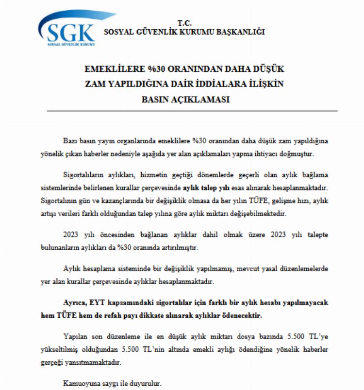 Bazı basın yayın kuruluşundaki söz konusu haberlere ilişkin yazılı açıklama yapan SGK, "2023 yılı öncesinden bağlanan aylıklar dahil olmak üzere 2023 yılı talepte bulunanların aylıkları da yüzde 30 oranında artırılmıştır. Aylık hesaplama sisteminde bir değişiklik yapılmamış, mevcut yasal düzenlemelerde yer alan kurallar çerçevesinde aylıklar hesaplanmaktadır" denildi.