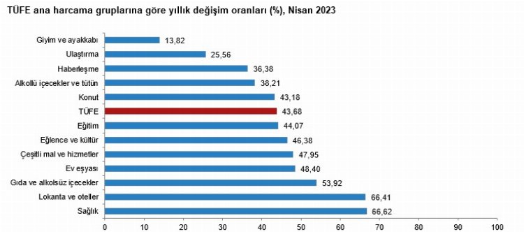 Tüketici fiyat endeksi (TÜFE) Nisan ayında bir önceki aya göre yüzde 2,39, geçen yılın aynı ayına göre yüzde 43,68 olarak gerçekleşti. TÜFE ana harcama gruplarına göre yıllık değişimde en yoğun artış yüzde 66,62 ile sağlıkta oldu.
