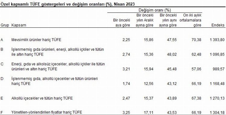 İşlenmemiş gıda ürünleri, enerji, alkollü içkiler ve tütün ile altın hariç TÜFE'deki değişim, 2023 yılı Nisan ayında bir önceki aya göre yüzde 2,74, bir önceki yılın Aralık ayına göre yüzde 15,36, bir önceki yılın aynı ayına göre yüzde 48,02 ve 12 aylık ortalamalara göre yüzde 62,48 olarak gerçekleşti.