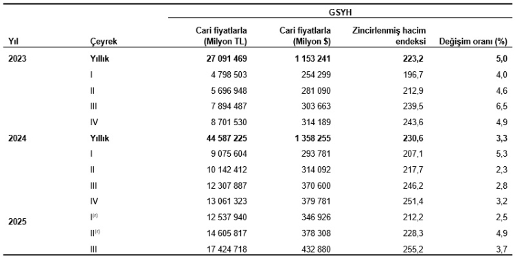 ANKARA (İGFA) - Türkiye İstatistik Kurumu (TÜİK), 2025 yılının üçüncü çeyreğine (Temmuz–Eylül) ilişkin dönemsel GSYH verilerini yayımladı.