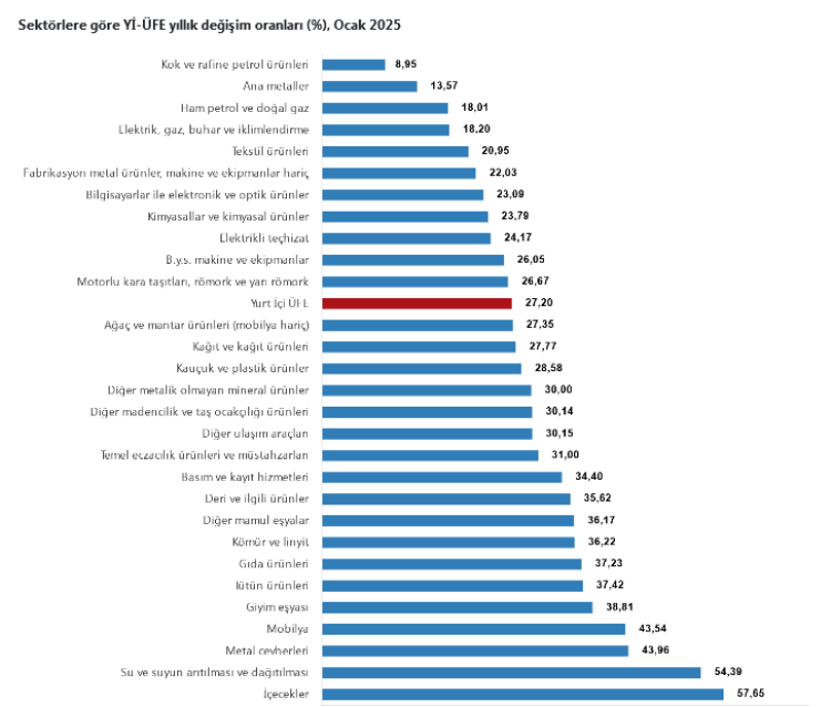 TÜİK, Ocak ayına ilişkin açıkladığı Yurt İçi Üretici Fiyat Endeksi (Yİ-ÜFE)'ne göre yıllık yüzde 27,20, aylık ise yüzde 3,06 oranında arttırdı.