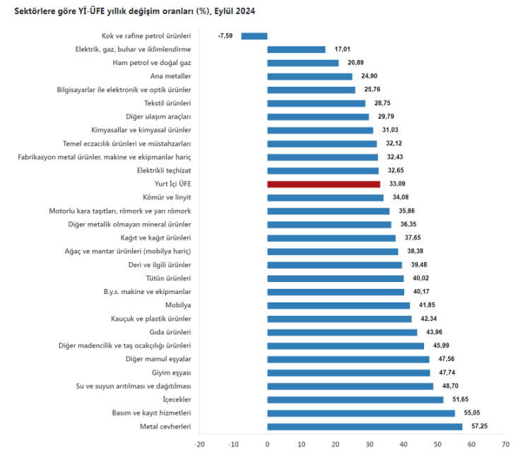 2024 yılı Eylül ayında bir önceki aya göre yüzde 1,37 artış, bir önceki yılın aynı ayına göre yüzde 33,09 artış ve on iki aylık ortalamalara göre yüzde 44,81 artış gösterdi.