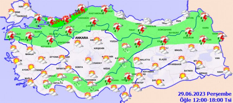 KUVVETLİ YAĞIŞ UYARISI; Yağışların sabah saatlerinde Tekirdağ, İstanbul'un kuzey ve doğu kesimleri, Kocaeli ve Sakarya çevrelerinde, öğle saatlerinden sonra Sakarya, Zonguldak, Düzce ve Bartın çevrelerinde, gece saatlerinde Samsun çevrelerinde yer yer kuvvetli olması beklendiğinden sel, su baskını, ulaşımda aksamalar gibi olumsuzluklara karşı tedbirli ve dikkatli olunması gerekmektedir.