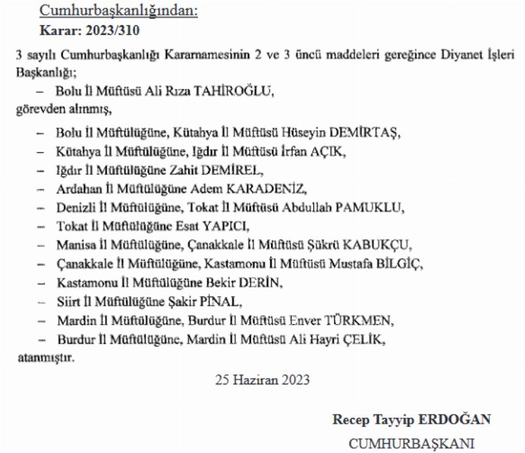 Cumhurbaşkanlığı kararıyla Bolu Müftüsü görevden alınırken, 5 ile yeni müftü atandı, 7 il müftüsünün ise yerleri değiştirildi.