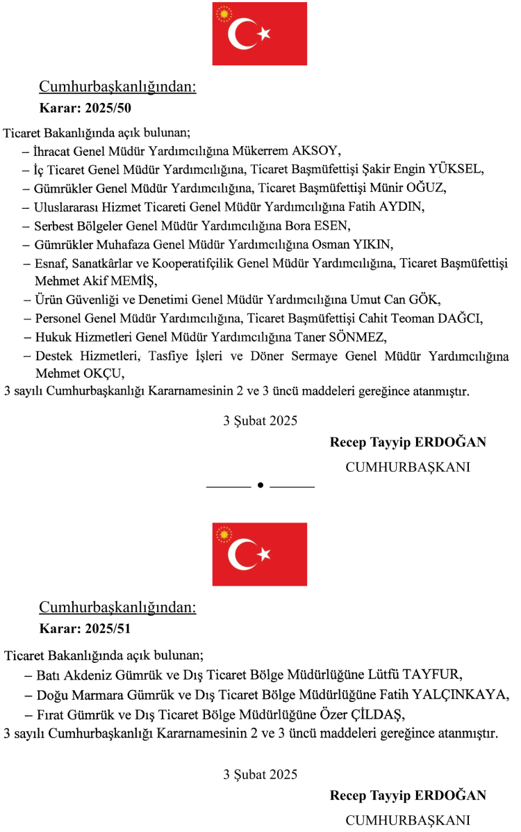 ANKARA (İGFA) - Ticaret Bakanlığı'na ilişkin atama ve görevden alma kararları Cumhurbaşkanı Recep Tayyip Erdoğan'ın imzasıyla bugünkü Resmi Gazete'de yayımlandı.