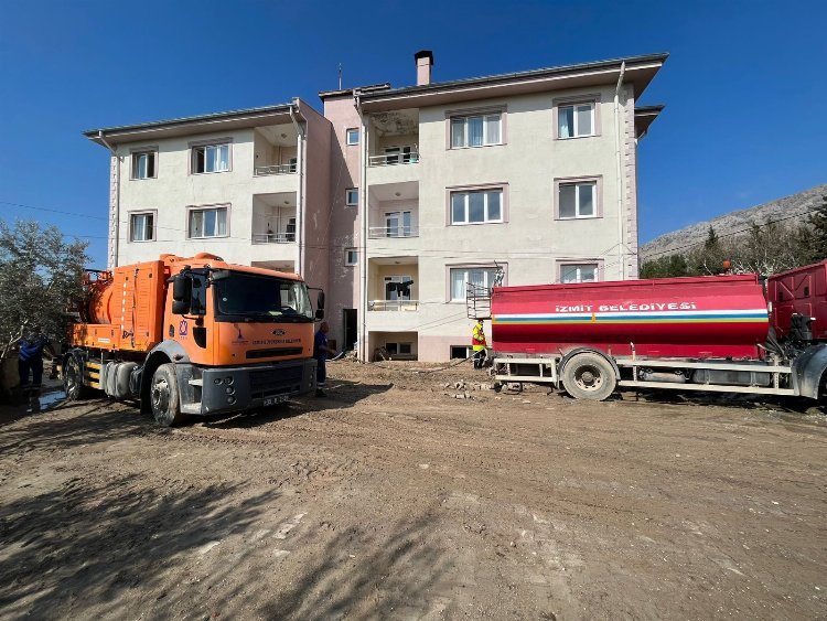 İzmit Belediyesi, sel felaketinin yaşandığı Adıyaman’ın Tut ilçesindeki polis lojmanlarının temizlik çalışmalarına destek veriyor