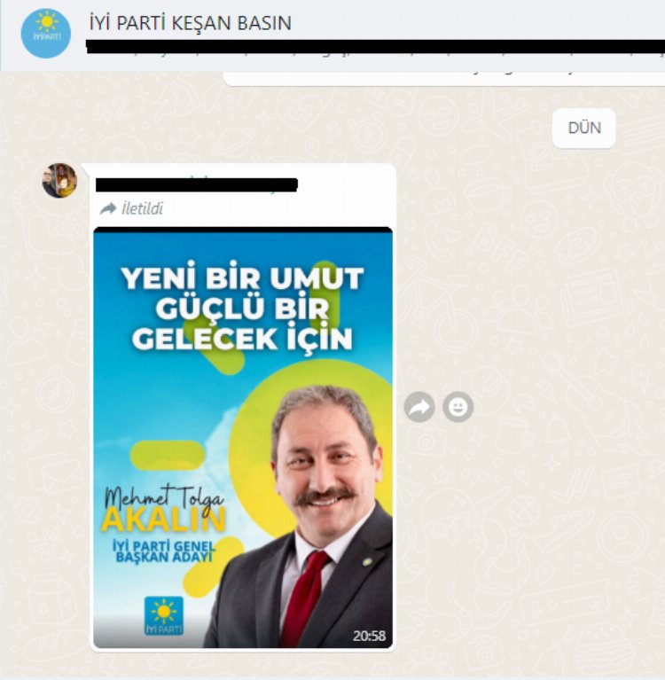 Akalın’ın bu açıklamasının ardından şu andaki İYİ Parti Keşan İlçe Yönetim Kurulu’nun kullanmadığı ve eski yönetim kurulunun kullandığı İYİ Parti Keşan Basın Whatsap Grubu’ndan da Mehmet Tolga Akalın ile ilgili genel başkan adayı olduğu afişi kafaları karıştırdı.