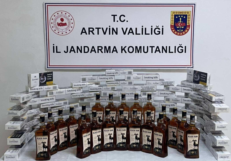 Artvin İl Jandarma Komutanlığı ekipleri gümrük kaçağı sigara ve içki ele geçirdi.