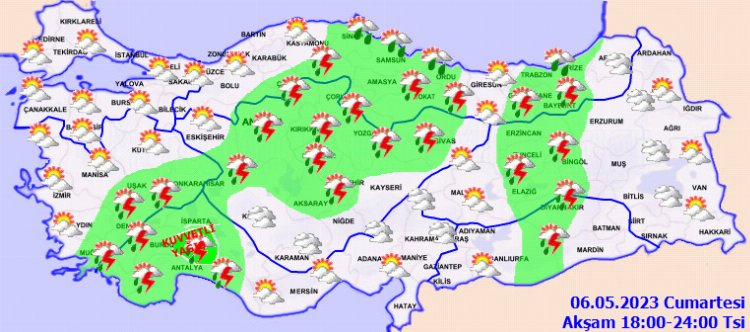KUVVETLİ YAĞIŞ UYARISI: Yağışların; Batı Akdeniz, Denizli ve Tunceli çevrelerinde yerel kuvvetli, Antalya merkez ve doğusu, Burdur’un doğusu ve Isparta’nın güneyinde yer yer çok kuvvetli olması beklendiğinden sel, su baskını, yıldırım, ulaşımda aksamalar, yağış anında kuvvetli rüzgar, yerel dolu yağışı gibi olumsuzluklara karşı dikkatli ve tedbirli olunmalıdır.