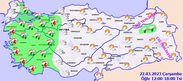ANKARA (İGFA) - Meteoroloji Genel Müdürlüğü tarafından yapılan son değerlendirmelere göre: Ülke genelinin parçalı ve çok bulutlu, Marmara, Ege, Batı Akdeniz, İç Anadolu(Sivas hariç), Batı Karadeniz, Orta Karadeniz'in iç kesimleri ile Adana'nın kuzey ve doğusu, Osmaniye, Erzurum çevreleri, Kahramanmaraş'ın batısı ve Hatay'ın batı kesimlerinin yağmur ve sağanak, yer yer gök gürültülü sağanak yağışlı geçeceği tahmin ediliyor. Sabah ve gece saatlerinde doğu kesimlerde buzlanma ve don olayı görüleceği tahmin ediliyor. Doğu Karadeniz’in iç kesimleri ile Doğu Anadolu’nun eğimli ve yüksek kesimlerinde çığ tehlikesi riski bulunmaktadır.