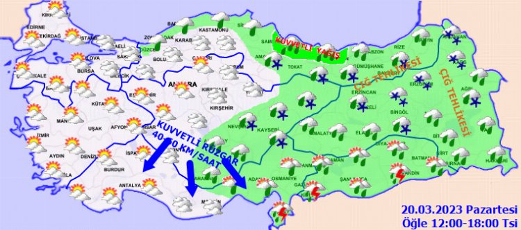 ANKARA (İGFA) - Meteoroloji Genel Müdürlüğü tarafından yapılan son değerlendirmelere göre: Ülke genelinin parçalı ve çok bulutlu, Doğu Akdeniz, İç Anadolu'nun güney ve doğusu, Batı Karadeniz kıyıları, Orta ve Doğu Karadeniz, Doğu ve Güneydoğu Anadolu ile Sakarya çevrelerinin yağışlı geçeceği tahmin ediliyor. Genellikle yağmur ve sağanak, Orta ve Doğu Karadeniz’in iç kesimleri, İç Anadolu’nun kuzeydoğusu ile Doğu Anadolu’nun kuzey ve doğusunun yükseklerinde karla karışık yağmur ve kar şeklinde görülmesi beklenen yağışların; Ordu ve Giresun çevreleri ile Samsun'un doğu kesimlerinde yer yer kuvvetli olması bekleniyor. Sabah ve gece saatlerinde iç ve doğu kesimlerde buzlanma ve don olayı görüleceği tahmin ediliyor. Doğu Karadeniz’in iç kesimleri ile Doğu Anadolu’nun eğimli ve yüksek kesimlerinde çığ tehlikesi riski bulunmaktadır.