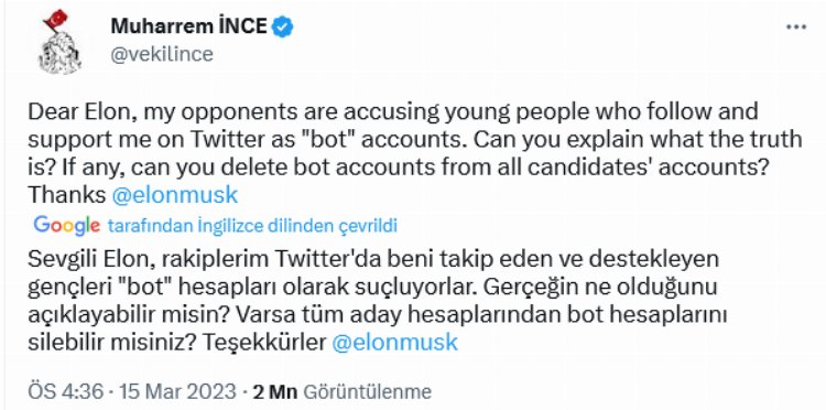 Muharrem İnce, paylaşımında, “Dear Elon, my opponents are accusing young people who follow and support me on Twitter as "bot" accounts. Can you explain what the truth is? If any, can you delete bot accounts from all candidates' accounts? Thanks” ifadelerini kullandı.