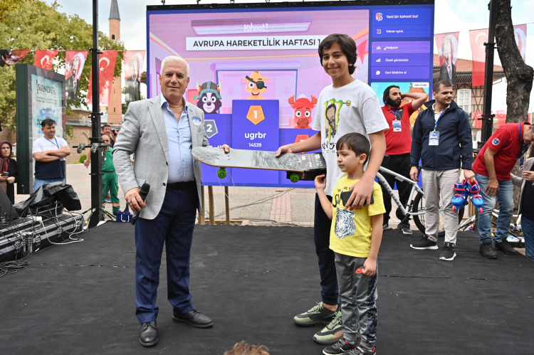 Konuşmalar sonrasında Başkan Bozbey, Kahoot yarışmasında dereceye giren çocuklara bisiklet, paten ve kaykay hediye etti.