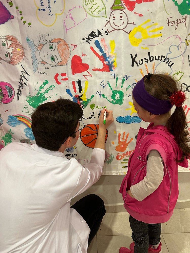 BURSA (İGFA) -Uludağ Üniversitesi Öğrenci Topluluklarından Renkli Gülücükler ekibinin yüz boyama etkinliği ile renklenen organizasyonda ,ikramlarve müzik eşliğinde hep birlikte 23 Nisan pastasını da kesen çocuklar tedavilerinden kısa bir süre olsa da uzaklaşıp eğlenme şansını yakaladılar.
