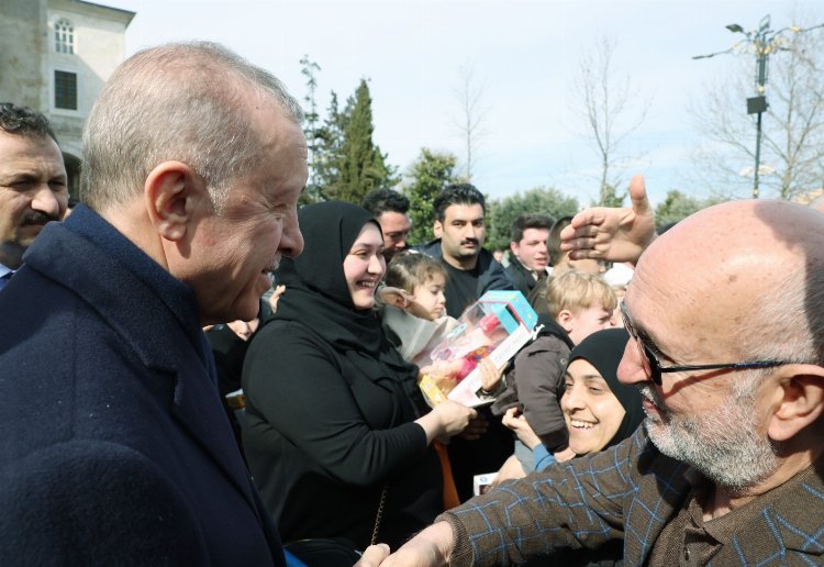 Erdoğan, cenaze töreni sonrasında cami çevresinde kendisine sevgi gösterisinde bulunan vatandaşlarla çay içerek sohbet etti.