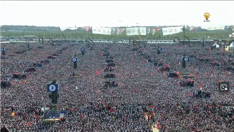 İstanbul Milletvekillerinin tanıtımlarının yapıldığı miting alanına ulaşan Cumhurbaşkanı Erdoğan, Yenikapı Etkinlik Alanı'nın 2 katı, Maltepe Etkinlik Alanı'nın ise 5 katı büyüklüğüyle tarihin en kalabalık mitinginden halka seslendi. Miting alanındaki resmi rakamlarla ilgili paylaşımda bulunan Cumhurbaşkanı Erdoğan, alandakilerin sayısının 1 milyon 700 bin kişi olduğunu söyledi.