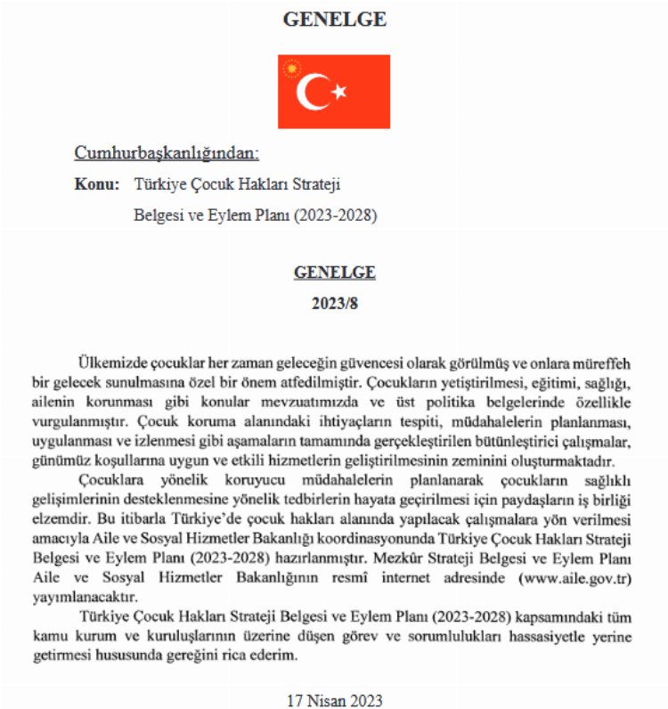 "Bu itibarla Türkiye'de çocuk hakları alanında yapılacak çalışmalara yön verilmesi amacıyla Aile ve Sosyal Hizmetler Bakanlığı koordinasyonunda Türkiye Çocuk Hakları Strateji Belgesi ve Eylem Planı (2023-2028) hazırlanmıştır. Mezkûr Strateji Belgesi ve Eylem Planı Aile ve Sosyal Hizmetler Bakanlığının resmî internet adresinde (www.aile.gov.tr) yayımlanacaktır. Türkiye Çocuk Hakları Strateji Belgesi ve Eylem Planı kapsamındaki tüm kamu kurum ve kuruluşlarının üzerine düşen görev ve sorumlulukları hassasiyetle yerine getirmesi hususunda gereğini rica ederim."