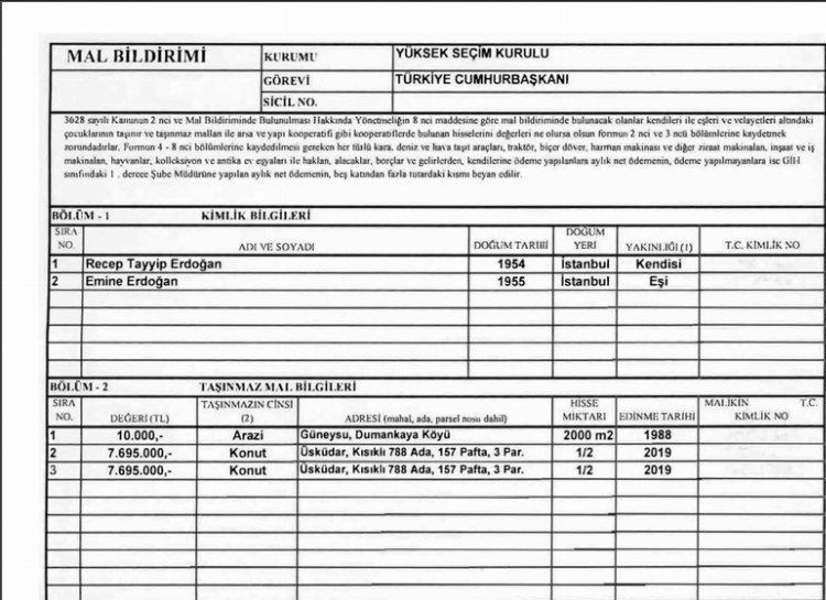 28 Mayıs seçimlerinin resmi sonuçlarının açıklamasıyla birlikte üçüncü kez Cumhurbaşkanı seçilen Recep Tayyip Erdoğan'ın mal varlığı da Resmi Gazete'de yayımlandı.
