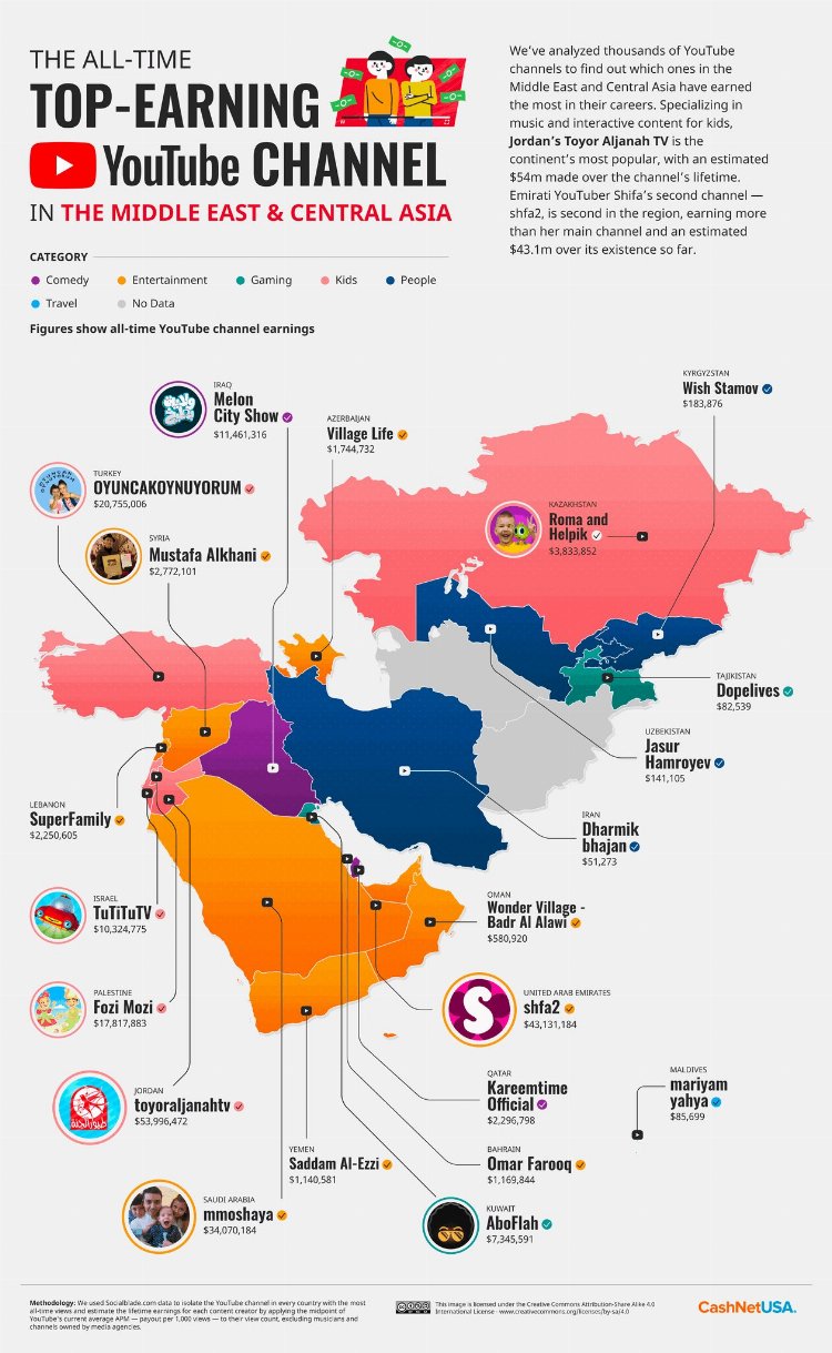 Orta Doğu ve Orta Asya bölgesinin en zengini 53 milyon dolardan fazla gelirle Toyor Al Janah oldu. 1994 yılında Ürdünlü iş adamı Khaled Maqdad tarafından kurulan Toyor Al Janah, 2008’de YouTube’a geçiş yapmadan önce yayın hayatına bir çocuk TV kanalı olarak başlamıştı.