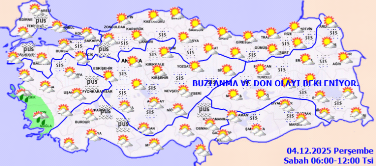 Gece ve sabah saatlerinde Marmara ile iç ve doğu bölgelerde pus ve yer yer sis görülecek. İç Anadolu’nun kuzeydoğusu ile Doğu Anadolu’nun kuzey ve doğusunda ise buzlanma ve don olayı bekleniyor.