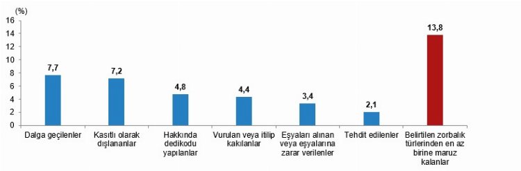 Türkiye çocuk araştırması sonuçlarına göre anneleri/temel bakım verenleri tarafından ayda en az birkaç kez diğer çocuklar tarafından zorbalığa maruz kaldığı belirtilen 6-17 yaş grubundaki çocukların oranı yüzde 13,8 oldu.