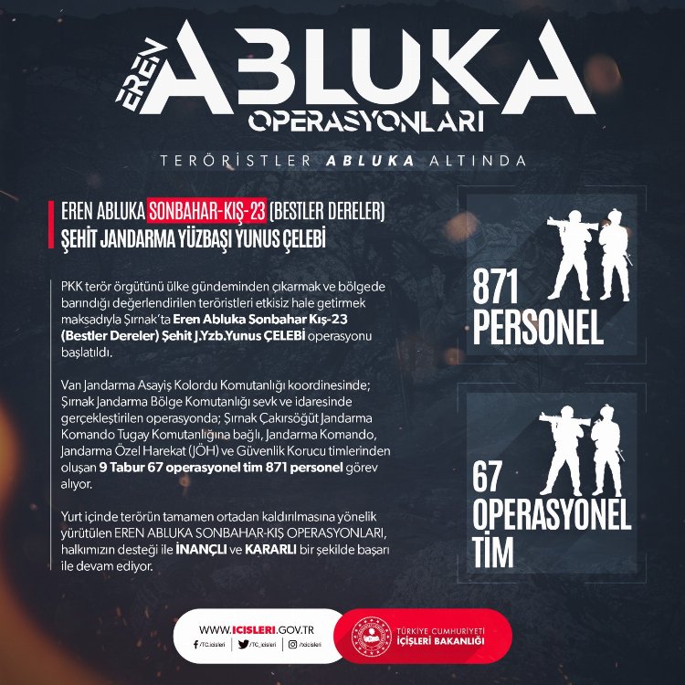ŞIRNAK (İGFA) - Kahraman Mehmetçik, ülkenin bölünmez bütünlüğünü korumak ve terör örgütüne en büyük darbeyi vurmak için aralıksız operasyonlarına devam ediyor. Bu kapsamda Şırnak'ta Eren Abluka Kış-23 (Bestler Dereler) Şehit Jandarma Yüzbaşı Yunus Çelebi Operasyonu başlatıldı.