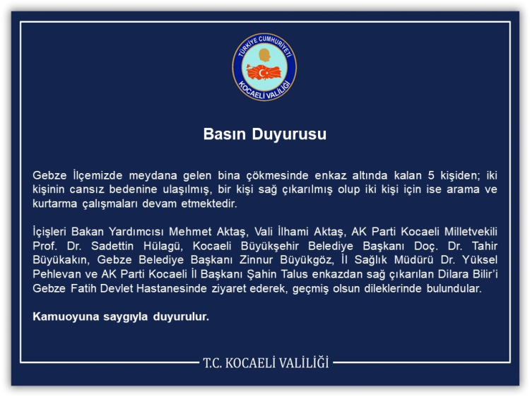 “Gebze’de arama-kurtarma ve enkaz kaldırma çalışmaları yoğun bir şekilde sürüyor. Biz de alanda ekiplerimize destek olarak koordinasyonun en verimli şekilde ilerlemesi için çalışıyoruz. Gebze’de yaşanan elim olayın ardından, çöken binanın yakınında ikamet eden 9 ailemizi, evleriyle ilgili teknik inceleme ve rapor süreci tamamlanana kadar Darıca’daki Balyanoz Koyu Sosyal Tesislerimizde misafir edeceğiz.”