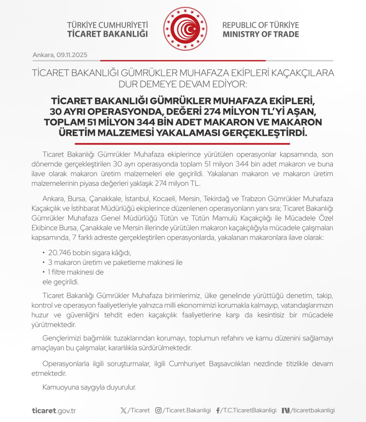 Ticaret Bakanlığı Gümrükler Muhafaza ekipleri, 30 ayrı operasyonda 51 milyon 344 bin adet makaron ve üretim malzemesi yakaladı. Operasyonlarda Bursa, İstanbul, Çanakkale ve Mersin'de 7 adrese baskın yapıldı.