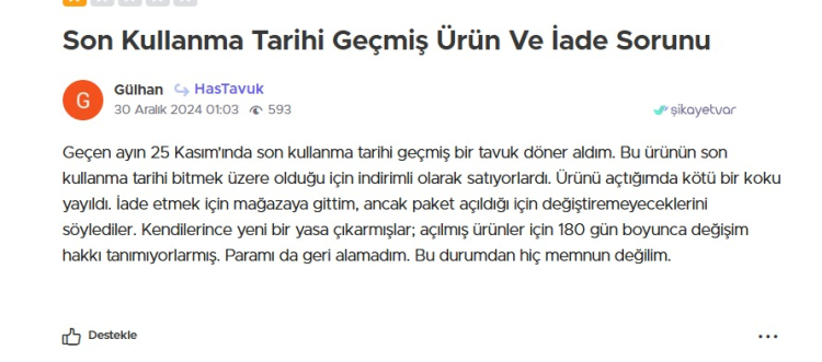 Hastavuk markasından döner aldığını belirten bir vatandaş, tavuğun içinden keskin bir cisim çıktığını söyledi. 3 aydır konuyla ilgili şikayet hattını aradığını da belirten kişi, “Şikayet üzerine kimse dönüş yapmadı. Böyle bir şey nasıl ihmal edilir? Çocuklarım yedi bunu. Bir çocuğa zarar gelseydi, bir de bir dönüş bile yapılmıyor. Bu kadar umursamazlık olamaz. Bütün şikayet haklarımı kullanacağım, buna özür bile denilmiyor.” şeklinde tepkisini belli etti.