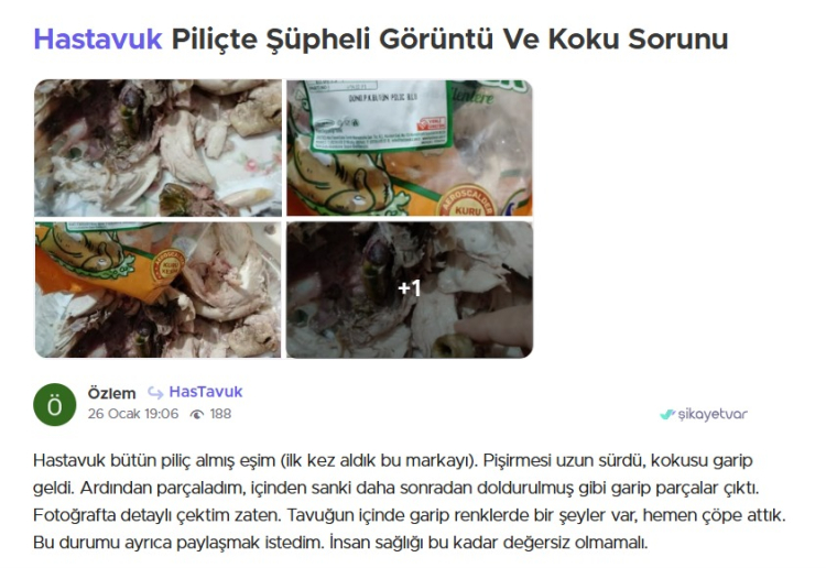 Hastavuk markasından bütün piliç alan başka bir vatandaş ise pişirmesinin uzun sürdüğünü ve kokusunun da tuhaf olduğunu belirtti. Şüphe üzerine tavuğu parçaladığını söyleyen vatandaş, “İçinden sanki daha sonradan doldurulmuş gibi garip parçalar çıktı. Fotoğrafta detaylı çektim zaten. Tavuğun içinde garip renklerde bir şeyler var, hemen çöpe attık. Bu durumu ayrıca paylaşmak istedim. İnsan sağlığı bu kadar değersiz olmamalı.” şeklinde şikayet iletti.