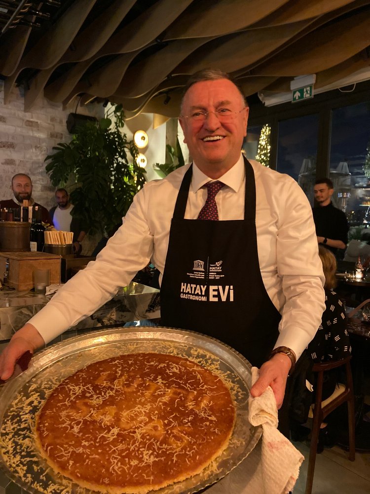 Hatay Büyükşehir Belediye Başkanı Doç. Dr. Lütfü Savaş ve eşi Prof. Dr. Nazan Savaş’ın katılımı ile gerçekleşen organizasyonda, kendisi de Hataylı olan ünlü aşçı Umut Karakuş’un yorumuyla 1 ara sıcak, 6 meze, 1 ana yemek ve 1 tatlıdan oluşan Hatay yemekleri menüsü davetlilerin beğenisine sunuldu.