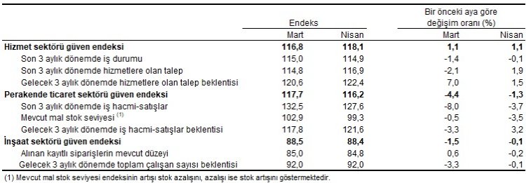 Mevsim etkilerinden arındırılmış güven endeksi Nisan ayında bir önceki aya göre; hizmet sektöründe yüzde 1,1 artarken perakende ticaret sektöründe yüzde 1,3 ve inşaat sektöründe yüzde 0,1 azaldı.
