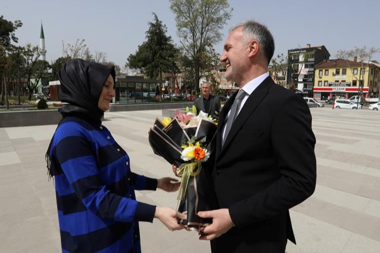 İnegöl Belediye Başkanı Alper Taban çiçeklerle karşılandı