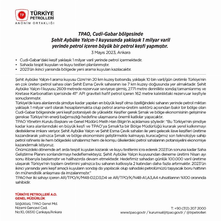 Bölgedeki çalışmaların 2018 yılında başladığını ardından jeolojiyi tanımaya yönelik saha çalışmalarına geçildiğini yazılı açıklamayla duyuran TPAO, Şehit Aybüke Yalçın-1 arama kuyusu Cizre’nin 20 km kuzey batısında, yaklaşık 10 bin varil/gün üretimle Türkiye’nin en çok üreten petrol sahası olan Şehit Esma Çevik sahasının ise 7 km kuzey doğusunda yer aldığını belirterek, "Şehit Aybüke Yalçın-1 kuyusu 2609 metrede rezervuar seviyeye girmiş, 2771 metre derinlikte sondaj tamamlanmış ve Kretase Karbonatları içerisinde 41° API graviteli haf petrol içeren 162 metre kalınlıktaki rezervuar keşfiyle sonuçlanmıştır" denildi.